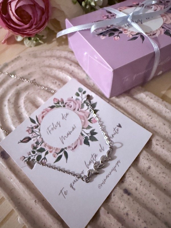 Box para mamá con collar de barrita de hojitas con strass de acero quirúrgico