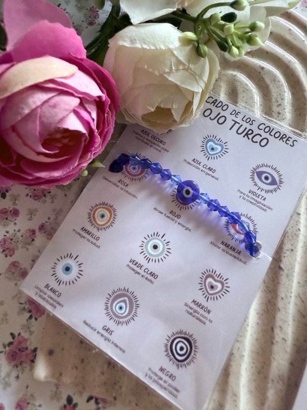 Pulsera de hilo chino azul con cristales azules y ojo turco de vidrio